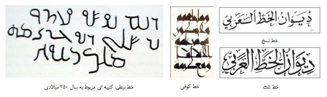 اگر بخواهیم سیر تحول خط عربی را بررسی کنیم می بینیم که سرمنشا آن به خط نبطی باز می گردد که از آن دو گونه خط به لحاظ شکلی به وجود آمده است. یکی خطی زاویه دار و هندسی که خطوطی با گرافیک انواع خط کوفی همه از این خط نشات می گیرند و خطی منحنی و روان که به وجود آوردنده انواعی از خطوط نسخ و ثلث هستند.